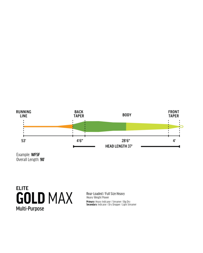 The RIO Elite Gold Max Fly Line is the latest and most powerful addition to the legendary Gold line-up, purpose-built for the angler who needs to cast and manage heavier, unwieldy rigs with ease. A true all-around powerful taper, the Gold Max is designed for situations not centred around tiny dry flies, giving you the ability to cast long distances and turn over plus-size rigs with authority. This line is a testament to the Gold series' guiding principle: empowering you to do more in the places you fish most.