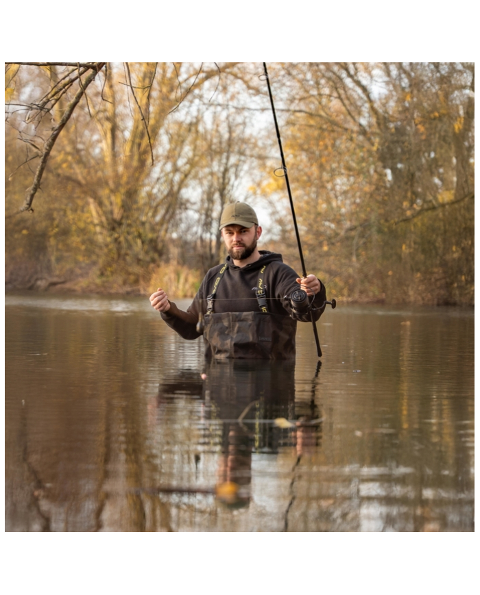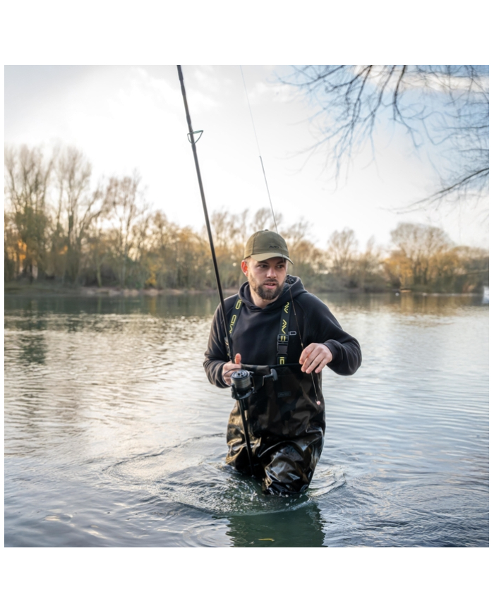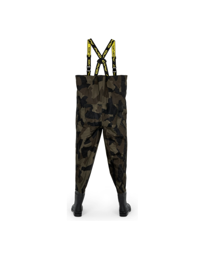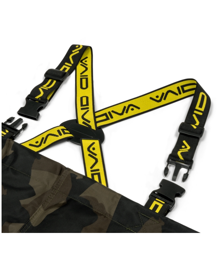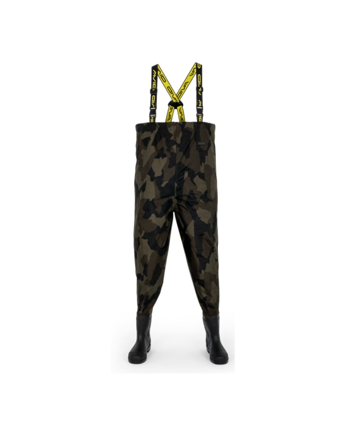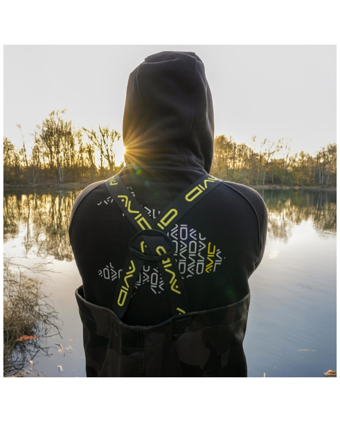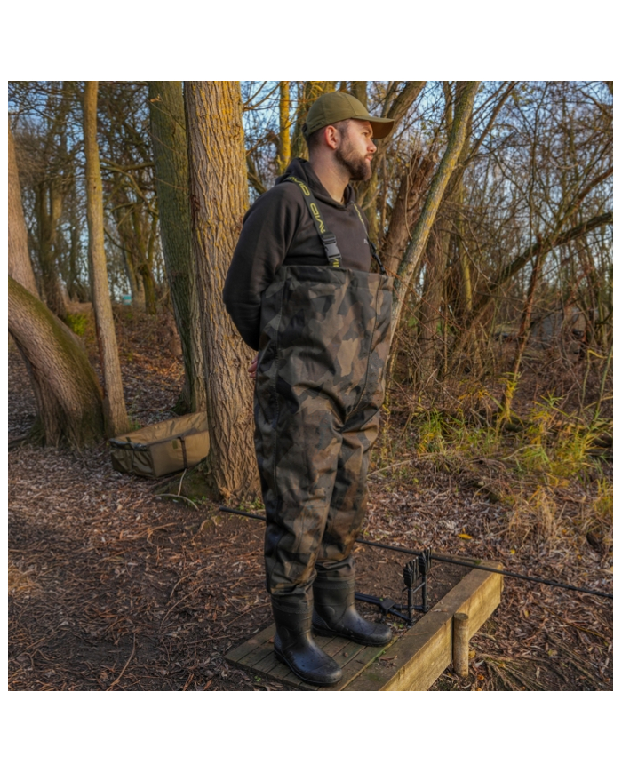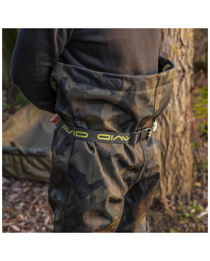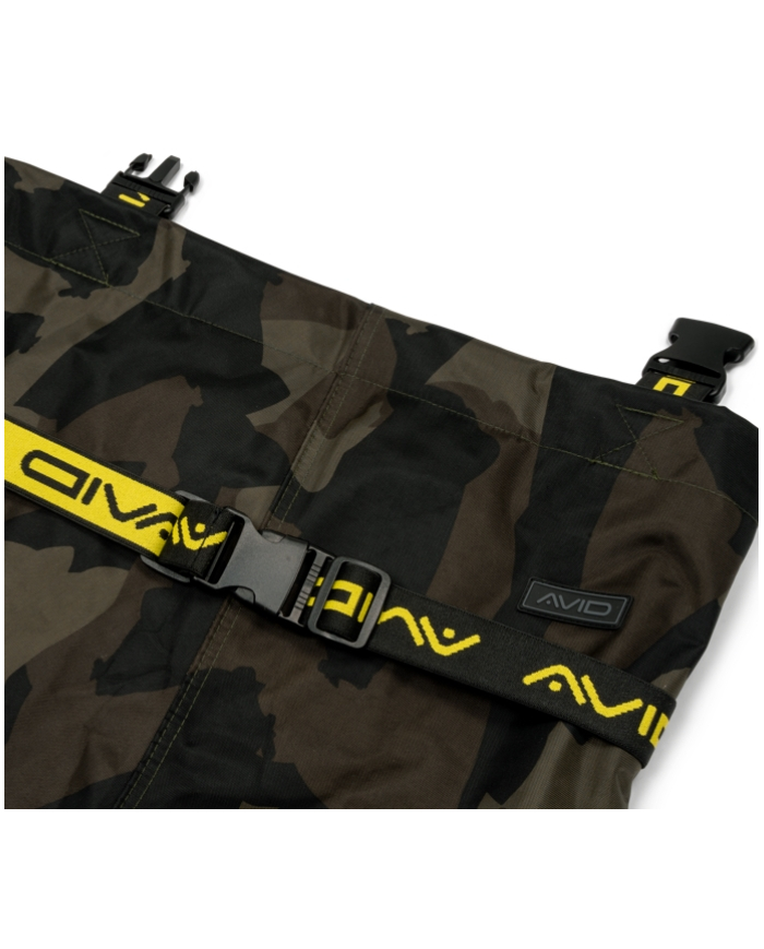 Constructed from lightweight yet robust 420D Distortion Dark-Camo fabric with fully taped seams for complete waterproof protection. Polyester inner lining for additional comfort. Elasticated, adjustable shoulder straps with Avid branding for a secure and comfortable fit. Reversed heavy-duty clips allow the straps to double up as a waist strap for added versatility. Drawcord chest adjustment lets you tailor the fit to your body. Internal pocket provides handy storage for small essentials. Reinforced knee and seat panels for extra durability in high-wear areas. Heavy-duty PVC boots with textured, hard-wearing soles for maximum grip and reliability.